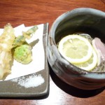 - 地鶏のレモン蕎麦とイカの天ぷら