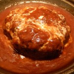 レンジでチンしたのかとも思わせるスピード!ハンバーグは陶板にのっていてアツアツ!肉も柔らかくデミソースも美味しくて満足の味でした。