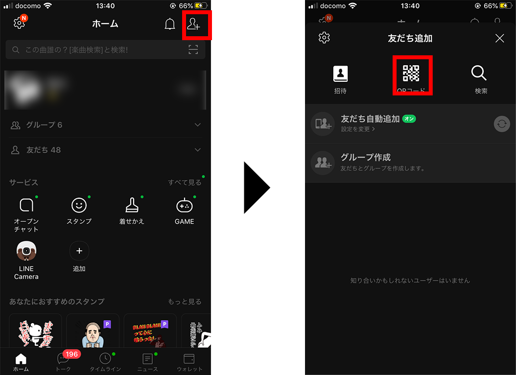 LINEのアプリを起動し、「ホーム」画面の右上にある追加マークをタップして下さい。